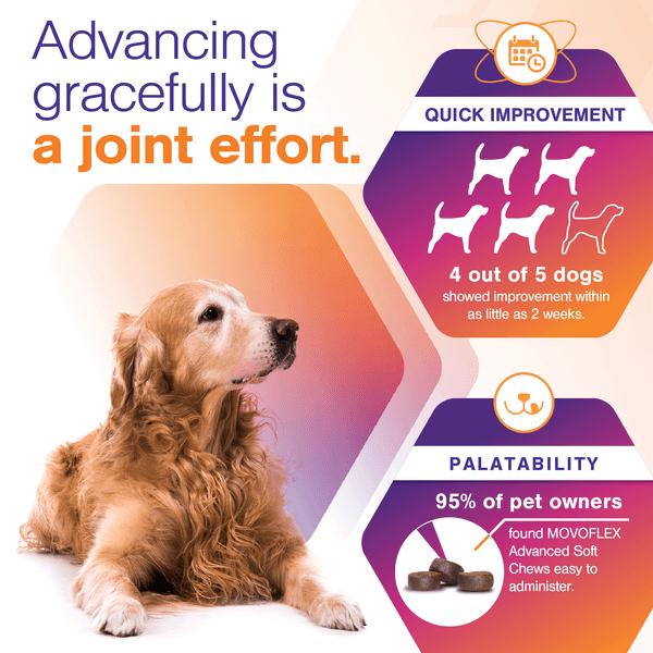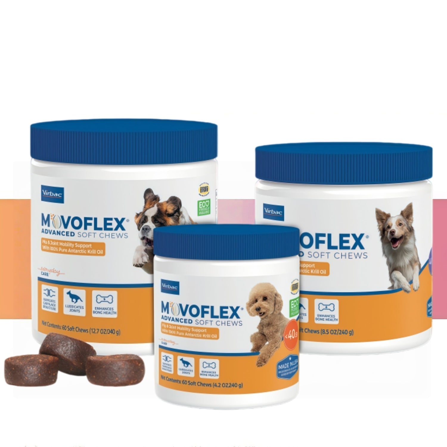 Movoflex®Advanced Soft Chews Mobility Support. Improved Mobility in as little as 1 week with 1 chew per day. Your dog may need mobility support if they are struggling to go on walks, jump on the bed, climb stairs, jump in the car, or play. Our once daily chew has a tasty chicken flavor dogs love. Movoflex Advanced Soft Chews have collagen-rich Biovaflex®eggshell membrane, plus 6 other powerful ingredients: